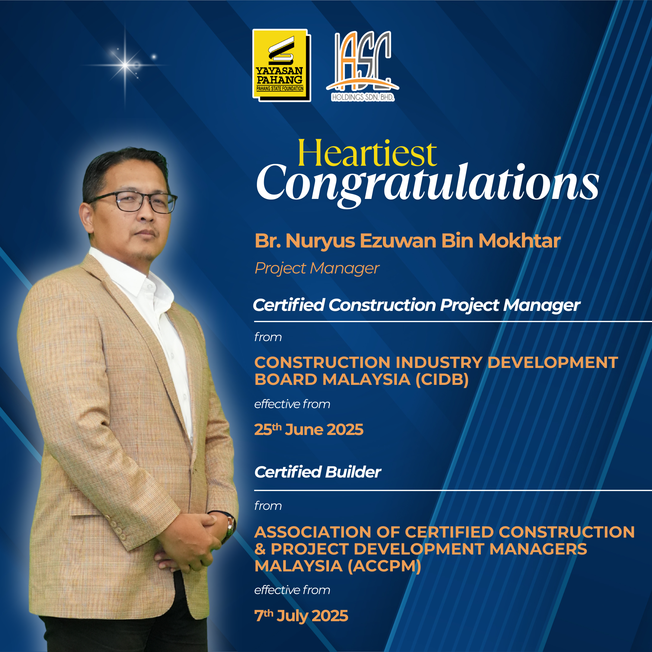 Oleh itu, IASC Holdings Sdn Bhd telah ditransformasikan dan didaftarkan sebagai syarikat kontraktor G7 oleh CIDB Malaysia pada 7 Oktober 2022.